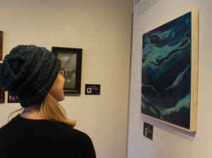 Artist Tracy Greenwalt typically uses old photographs to creates her paintings and the fictional stories for their subjects, so she found herself uniquely challenged in choosing an object other than a photo for her exhibit artwork. Ultimately, she landed on a Chanchito, a terra cotta three-legged pig figurine made in Chile that are widely given as symbols of friendship and luck. The origins of why these pigs are lucky is unclear, but the thinking is that a three-legged pig that can still stand must be lucky. Greenwalt, who frequently incorporates animals in her paintings, decided to add the pig into a story in which is has brought good luck to a family that may need it. “So it’s [like] an old family portrait and it’s kind of like their sour-in-nature faces are maybe a little less sour because the pig brought them good luck,” she said.