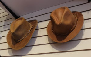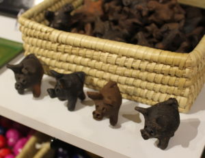 SOHG founder and sculptor Judy Hoberg frequents Global Gifts for their selection of fair trade chocolate, but it was the assortment of hats they sell that served as the inspiration for her exhibit artwork – specifically, she loves seeing the reactions of visitors to the store, particularly of those who vogue while trying on the hats. Hoberg’s whimsical hare sculpture is trying on three of the hats featured at the shop, including: a leather hat from Ecuador, made with ethically obtained leather, meaning the hide is collected after an animal passes naturally; a sun hat from Senegal made with a wax printing technique called kitenge; and a brimless, rounded cap called a kufi from Nepal, made by artisans who have fled violence in Tibet and have settled to build new lives.