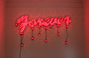 The word “Forever” is emblazoned across the wall in red script, simulating drips of blood with the help of a computer-generated pattern. The piece, titled “Bloody Forever,” is one of a series by artists Tim Noble and Sue Webster in which they playfully use carnival-esque signage to display flashy words. In discussing the work, Noble has focused on how the word “forever” can be interpreted as relating to both a single human life and the infinite beyond. Additionally, the red drips suggest an emphasis that denotes the promises we make to each other despite the mutability of the word.