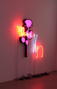 Another piece in the exhibit that uses wordplay to send a message is Andrea Bowers “Womxn-Women.” The artist, who uses her work as a form of human rights activism, conveys the power of language through art by contesting meaning. In the exhibit piece, a single letter of a neon sign flashes back and forth, between an “E” and an “X,” to create different thoughts about the same idea. The term “Womxn” is a fairly new one that seeks to express multiple meanings, one being that women are more than extensions of men, calling to mind certain Biblical teachings. Another meaning highlights how gender is understood, or misunderstood, as it were, and seeks to include the oft-excluded trans community.
