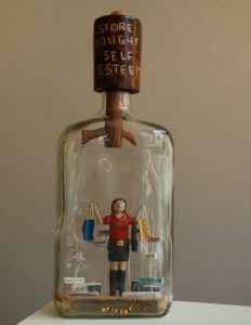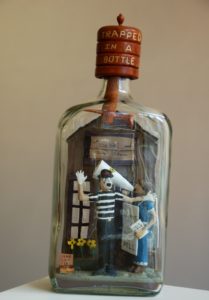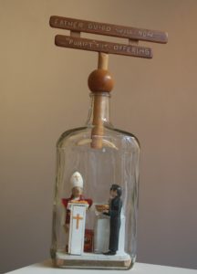 During our recent chat with artist Steve Moseley, he uttered this phrase at least three times, “I’ll tell you a story.” Sharing anecdotes about his work and viewers’ reactions to it is part of the fun for the St. Louis-based artist, who chooses subjects about “the things that are impolite to talk about in polite society – religion, politics, and sex,” he said. Moseley creates what he calls “Patience Bottles” – because of the patience required to create them – also known as Whimsy Bottles. These works are similar to ships in bottles, but rather than having painstakingly recreated static objects, they follow a long folk art tradition of depicting scenes, particularly of the satirical variety in Moseley’s case.