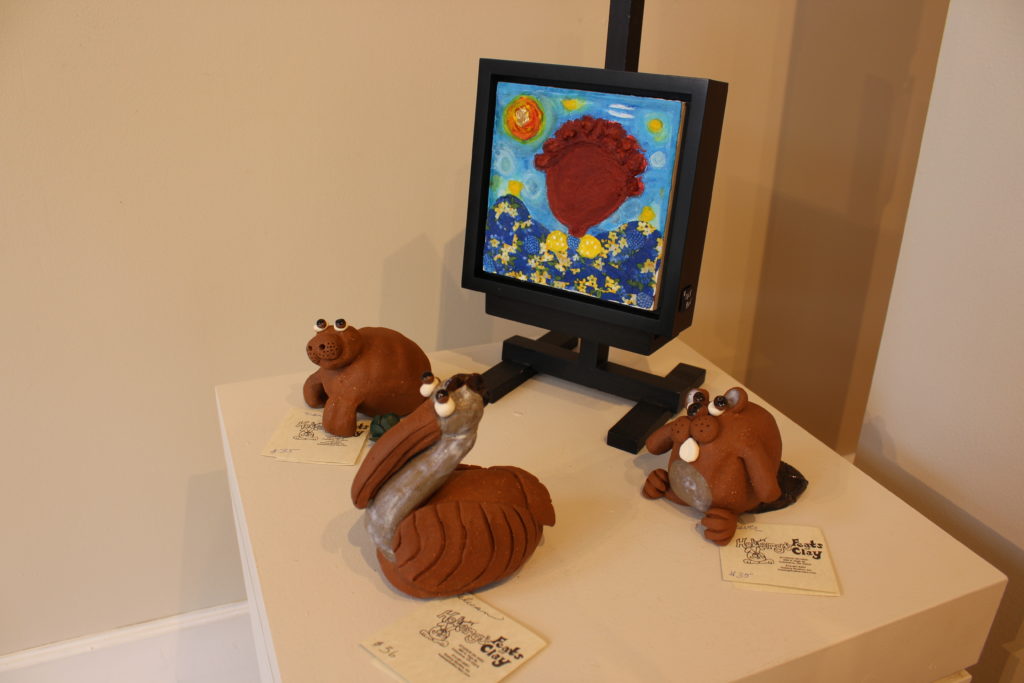 Clay artist Judy Hoberg thinks art “flatters the recipient by implying they are a person of taste who would enjoy originality,” she said. She enjoyed making smaller version of her signature “critters” because shrinking their features was “a fun challenge.” Similar to Sostrom, she also enjoys Bucklew’s framed metal pieces, which she calls “ especially appealing.”