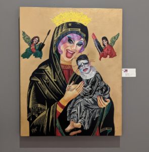 One of the most striking paintings in the show, titled “Chosen Family,” depicts saint-like figures that are most easily recognizable to locals: West drag family members Nina West, Virginia West, Kari Kerning, and Christian Cimoroni. This piece merges two of Richmond’s cultural memories – the Columbus LGBTQ community, and his childhood church. The image is stylized like a stained glass window and was chosen because he felt there was an connection between the feeling of belonging that people get from being part of any community. He chose the West family for both their importance in the local LGBTQ community and in his own life. When he came out as gay and went to Axis for the first time, he met Nina West, “this big, cartoonish, bubbly character,” he recalls. “I think she could sense there was this new, young, nervous thing; she came over and gave me a hug, welcomed me, and made me feel so at ease. I was like, ‘I found my people, it’s magical here.'” He has since had a close friendship with West and the many members of the family.