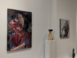 Armed with only the title of the show and given free reign over the concept, Richmond chose to paint masked figures to highlight those on the fringes of mainstream society; “people who are marginalized and made invisible by the patriarchy,” he said. As most of his work includes a figurative component, adding masks proved an interesting challenge for Richmond as he tried to convey facial emotion, elicit a sense of empathy, and reveal more about the subjects while they were partially concealed. A natural storyteller, the Columbus College of Art & Design alum used bold colors and gestural, emotive marks and expressive paint application techniques to create rich textures and give his subjects physicality. “I wanted the masks and the choices I made on the canvas to make the figures have a strong presence as a way of saying, ‘we are here, you can’t make us invisible,'” he said.