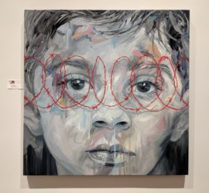 Fans of Richmond’s work will likely recognize another piece in the show, titled “American Dreamer,” which also deals with a tough subject that is personal to him. The piece, a slightly more abstract close up of a child’s expressive face that uses muted tones and sparse pastels, is overlain with a thin but prominent coil of vibrant, angry red barbed wire, its sharp spikes menacing palpably from the canvas. Richmond, who has many immigrant friends and neighbors, created this piece as a way to depict his heartbreak from and frustration with the way an entire community has been depicted by American politicians. “The barbed wire is very much like the mask the politicians are creating to hide the humanity of these wonderful people, and to prevent us from feeling empathy for them,” Richmond said. “When I painted the barbed wire, it was so painful; I felt like I was harming this person I had created.” The piece has since been used with his encouragement by activist group Vigil for Democracy, which protests recently-enacted punitive immigration laws and regulations by projecting the piece onto government buildings and displaying it on mobile billboards.