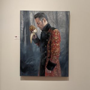 Another painting in the exhibition that is close to Richmond’s heart, titled “Wounded Healer,” depicts his husband, Dennis Niekro, the former Muse Gallery employee and current oncology nurse practitioner. The painted figure wears a long, resplendent coat and intricately-decorated beak-like plague mask as a play on Renaissance doctors, the mask meant to both protect them and make them instantly recognizable. Niekro helped with developing the piece, choosing the coat and the figure’s setting, a foggy forest, as a nod to their current home in misty Monterey, California. “When [Niekro] is treating patients, he almost has to wear a mask to separate his own identity and emotions from the situation,” Richmond said. “But, a lot of times he’ll have to take it off and be very vulnerable and real with his patients if he’s delivering difficult or painful news.”