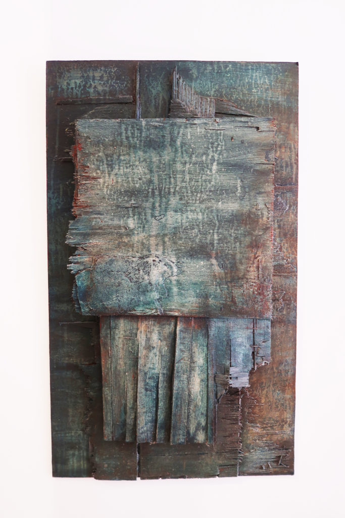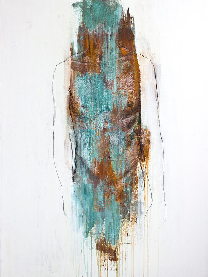Painter states, “My work is about a need to build and destroy, to allow physicality and natural properties of elements to create and guide the work and myself. I use the chemical reactions of iron and copper to create my palette and their patinas to guide the image or subject. I use traditional elements of charcoal, ink, and lead to define and detail the subject. The work suggests beauty within disorder and vulnerability within destruction. The works are created out of my reaction to the evolution of marks and colors in order to find a figure that creates a cohesive piece.”