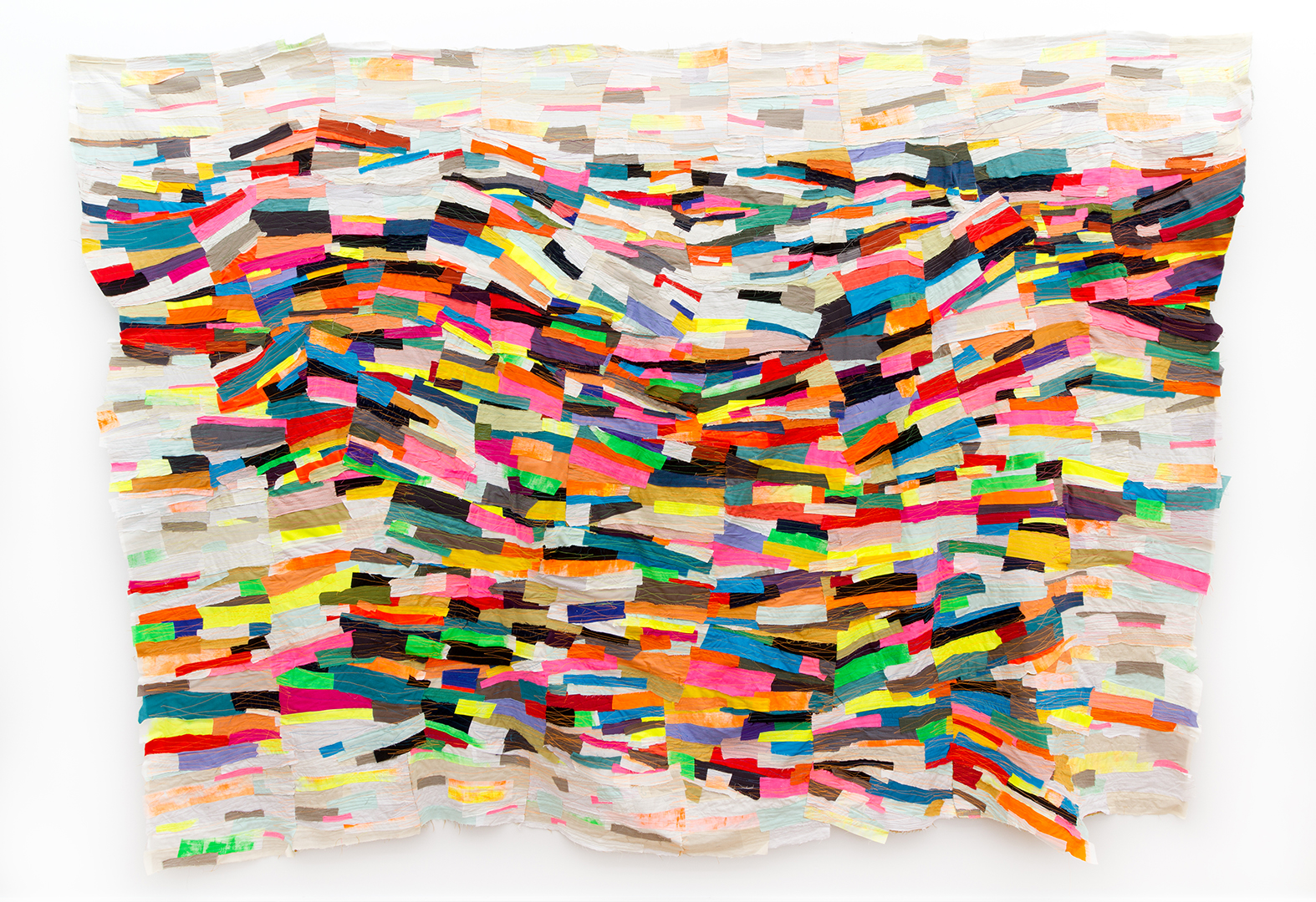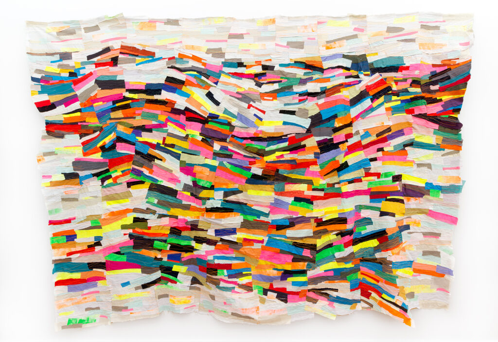 During the August Gallery Hop, Andrea Myers exhibition, âAnd so the sky softly unfoldsâ, will also be on display. Myers is known for colorful abstract works that reference nature, atmospheric, and perceptual phenomena. Though she uses the format of painting and is engaged with the elements of art like a painter, fabric is her medium. She sews together strips of color like brushstrokes, while maintaining the fabricâs associations with craft and all it insinuates: mending, care, domesticity, and the time taken in that realm. This new series highlights horizontal stitching and evokes everything that is ordered around the horizon: water, sky, and land simultaneously. The effect is what we see on a bright summer day, our eyes reading light as it bounces off moving water, hits the undersides of clouds, or rakes through a window. Stop in, experience this perfect summer exhibition, and see how a sunny day can shift how things are seen.