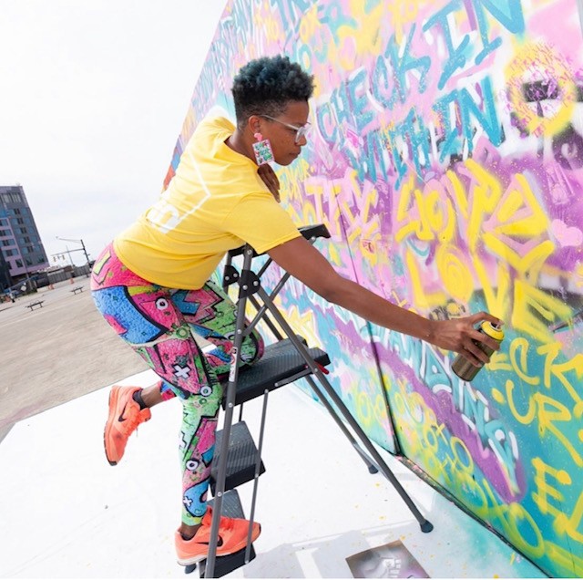 Felicia Dunson, who works under the name “FDZgraffiti,” is a trained fine artist and art instructor with an urban arts background who lives and works in Columbus, OH. Her passions include sharing her gift with the community and fashion, and finds inspiration in music, pop culture, and bold, bright colors.