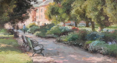 Ranging from pastoral farms to small town streets, Gingerich scouts for his subject matter until he finds a sense of visual harmony in repeating colors and patterns of light. The resulting compositions offer an intimate glimpse at how the artist’s trained eye works. Scenes that we may find commonplace and even overlook are animated and renewed by Gingerich’s impressionistic brushwork and palette knife markings. A warm atmospheric quality ties together the paintings which seem to be bathed in an ethereal light.