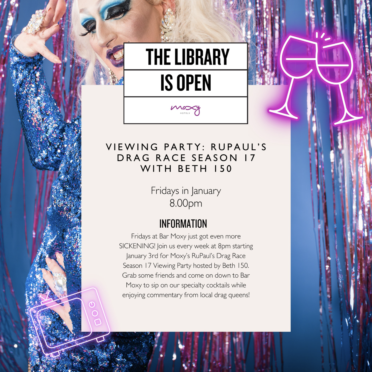 ABOUT THE EVENT Fridays at Bar Moxy just got even more SICKENING! Join us every week at 8 PM starting January 3rd for Moxy’s RuPaul’s Drag Race Season 17 Viewing Party hosted by the fabulous Beth 150!