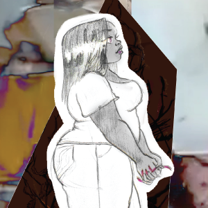 Anime Omission (Composite) dives into themes of role playing and animation not commonly attributed to the “Big Black Woman” archetype. The fictional character’s pose and role play is based on the character Ayanami Rei from the animated series “Neon Genesis Evangelion,” created and directed by Hideaki Anno, while the background is a collage of films depicting black women in various media.