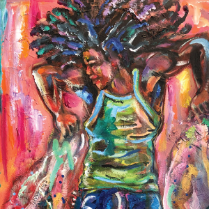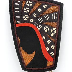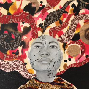 Bogolan Queen was inspired by Jackson’s love of African fabrics, colors, textures, and reflective symbolism. “Bogolanfini” is another name for Mud Cloth, made by the people of Mali. Jackson imitated the cloth and adorned the woman’s hair to represent a majestic crown.