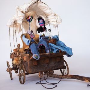 Savage’s sculptures are made with wire arms and legs that bend and loop with unnatural grace, that are then wrapped in the bright colors of African fabrics.
