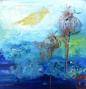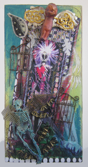 Vickie Moon Spiegel is a Columbus artist, CCAD alum and retired graphic artist for the Columbus Zoo. Her current show is a celebration of Halloween, Day of the Dead and things that go bump in the night. She uses mixed media, collage, encaustic techniques and found objects in her work.