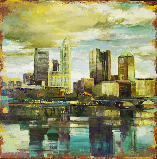 Curt Butler’s vibrant landscape and urban scenes depict a recollection of a place rather than a literal interpretation of a distinct locale. Capturing both recognizable scenes of Columbus as well as undiscovered settings, Butler’s luminescent paintings function as a memory on canvas. Butler works with the delicate medium of encaustic, a melted beeswax, fusing it with oil paint and then building up layers of color that resonate with a subtle waxy sheen. Butler often scratches into the painting’s surface, revealing the layered history of its creation and contributing to the overall sense of memory in the painting’s final composition.