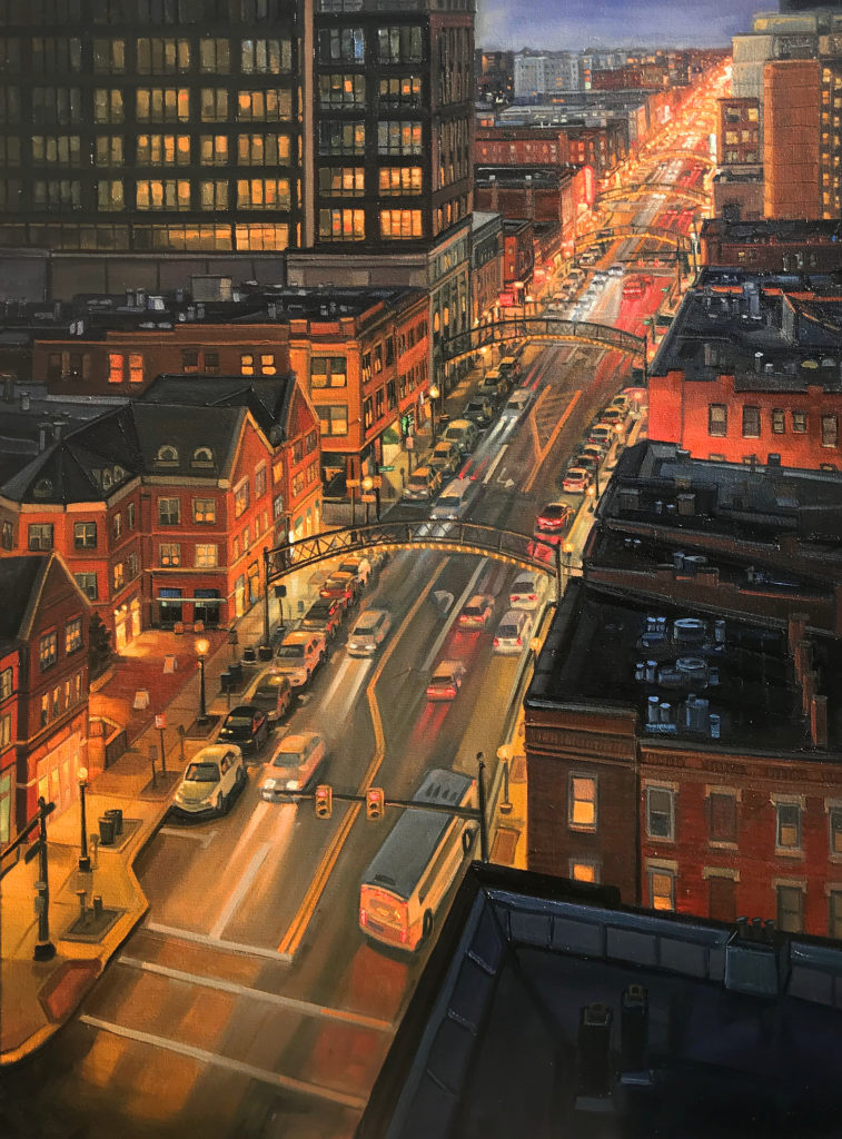 Wojtasek’s nocturne paintings balance realism with abstraction to create an illusion of reflectivity, placing the viewer directly in the scene. These works depict the city of Columbus with drama, mood and personality.