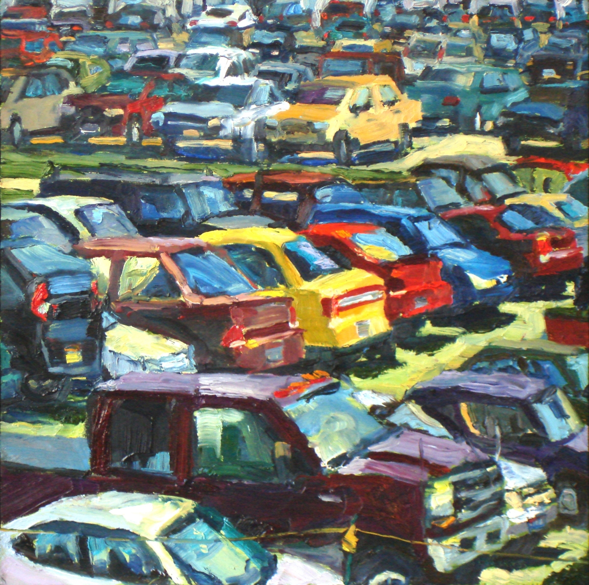 Lombardo then attended Bowling Green State University, where he began a series of parking lot paintings for his Master of Fine Arts thesis. “In 2007, when gas started to be a crisis and prices were going really high for oil, I was looking around at the landscape, trying to find something that could sustain me,” Lombardo said. “In Bowling Green there are these huge overflow parking lots. The cars don’t move a lot because the students don’t need their cars all the time, so I would go and set up in the parking lots and and paint the parking lots.